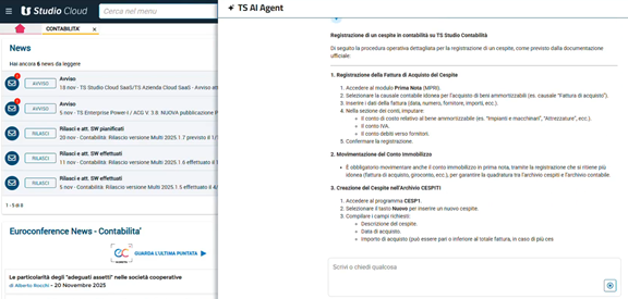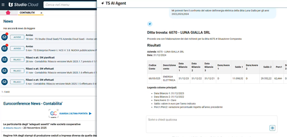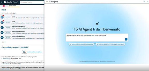 Accedi al tasto TS AI Agent e lavora con tutto il potenziale dell’Intelligenza Artificiale in ogni contesto: contabilità, bilanci, dichiarazioni e paghe.