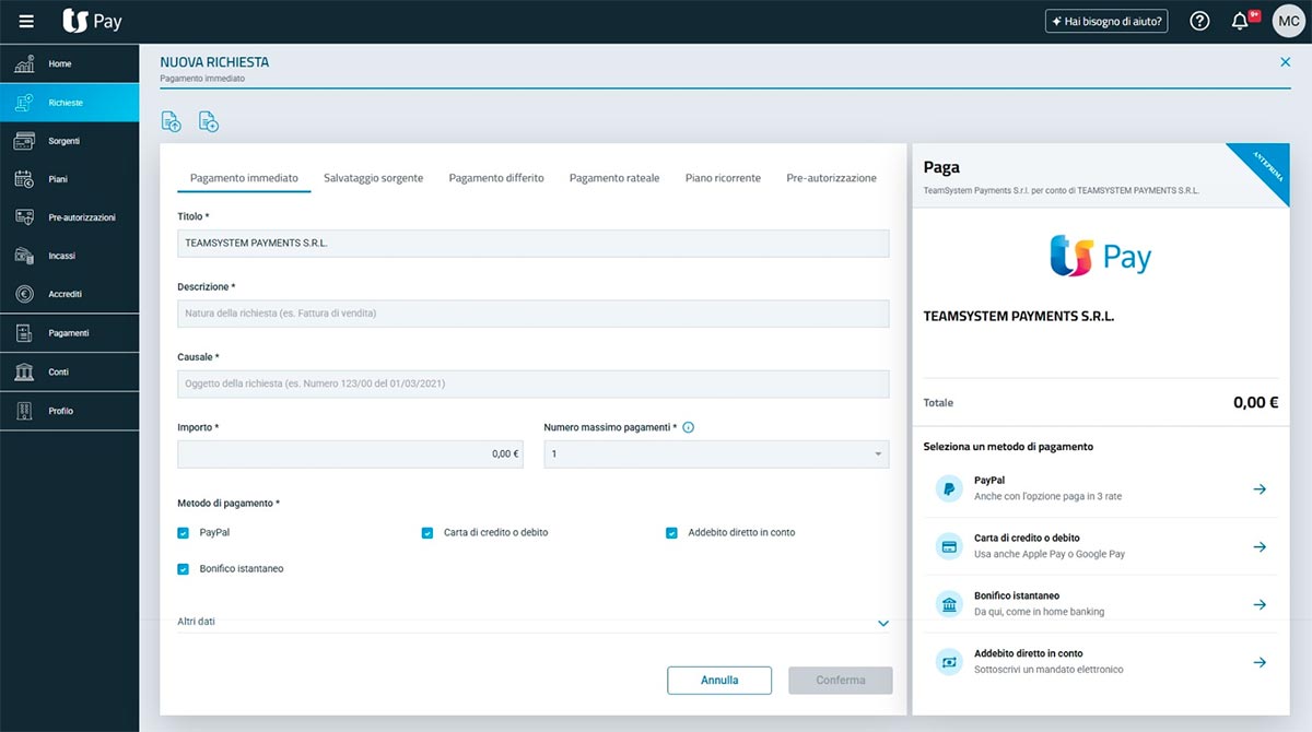 Abilita i tuoi clienti ad effettuare pagamenti digitali tramite diversi metodi di pagamento oltre alle carte di credito e debito. Potranno utilizzare anche Wallet digitali (Apple Pay e Google Pay), PayPal, l'addebito diretto su conto corrente (SDD) e bonifico istantaneo.