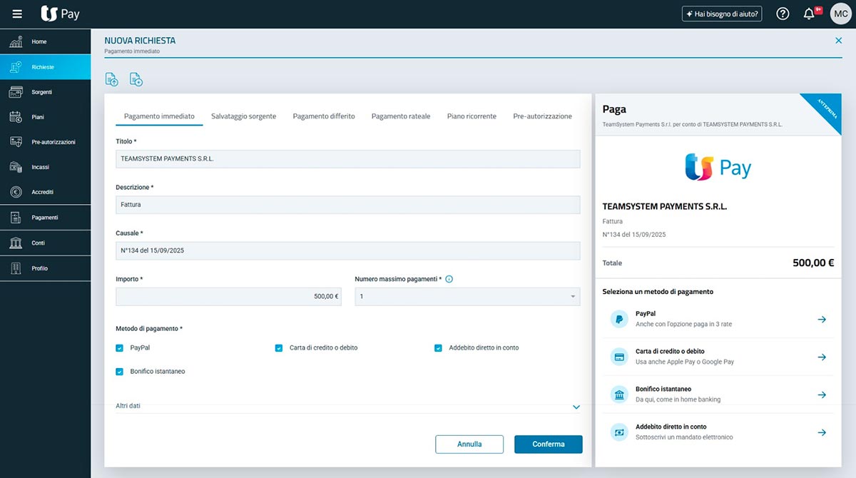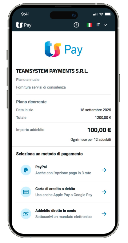 Il pagatore autorizza il piano, inserisce il metodo di pagamento (carta o addebito diretto) e conferma l’operazione. TS Pay addebita gli importi corrispondenti alle scadenze previste.