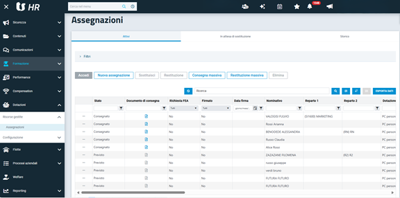 La gestione delle dotazioni consente di popolare l’anagrafica di ogni oggetto fisico o virtuale che possa poi essere assegnato a un lavoratore, completa di tutti dati che la contraddistinguono (lotto, targa, matricola o altro).