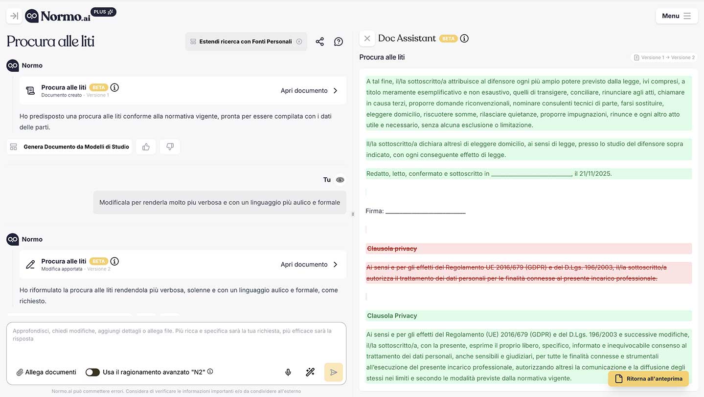 È la soluzione ideale per pareri complessi, strategie difensive, analisi di rischio e scenari alternativi: puoi chiedere a Normo.ai di motivare le soluzioni, evidenziare interpretazioni diverse e segnalare i punti critici su cui concentrarti.
