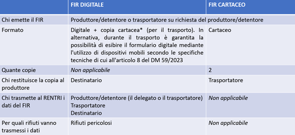 Gestione del FIR digitale, tabella elaborata dal MASE per illustrare le differenze tra il FIR cartaceo e il FIR digitale